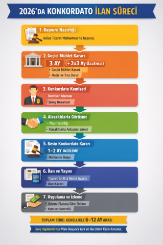 Türkiye’de 2026 itibarıyla konkordato ilan sürecini adım adım ve süreleriyle gösteren güncel bir tablo hazırlayalım: